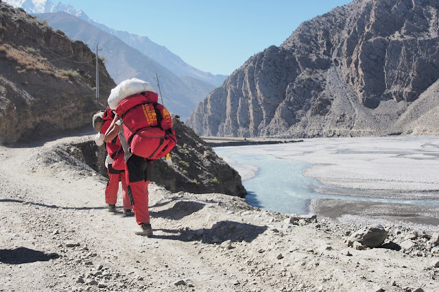 Er kommt aus dem kleinen Bergdorf Mudi, weiter unten im Tal. Nach eigener Aussage hat er die Schule nicht lange besucht, schon in jungen Jahren arbeitet er auf dem kleinen Bauernhof seiner Eltern mit, zusammen mit seinem Bruder und seiner Schwester. So vor 10 oder 12 Jahren legt er eine Prüfung ab, so dass er nun als Träger arbeiten kann. Dazu muss er auch einen englischen Sprachnachweis abliefern. Die Saison dauert ungefähr sieben Monate, in dieser Zeit bietet er seine Dienste vor dem Flughafen in Jomsom an. Die Treks, zu denen er dann verpflichtet wird, sind unterschiedlich lang. Ein Tag wie bei uns, dann auch längere, mehrwöchige Touren. Manchmal wird er auch von Reiseveranstaltern verpflichtet. Aber es gibt auch Tage ohne Arbeit. Außerhalb der Saison arbeitet er dann entweder bei seinen Eltern oder macht andere Aushilfstätigkeiten. Witzig ist seine Aussage, dass die koreanischen und russischen Touristen das schwerste Gepäck haben. Da sind unsere kleinen Rucksäcke wohl nicht zu viel, obwohl Albert und ich uns schon Gedanken darüber machen, dass wir beide unser Gepäck von einem anderen tragen lassen. Auf jeden Fall bleibt Hira uns beiden als sehr aufmerksamer, fürsorglicher und einfühlsamer Mann in Erinnerung.
